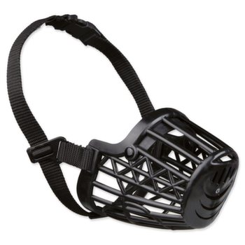 Plastový náhubok s koženým pásikom.