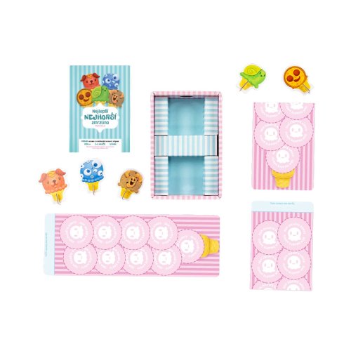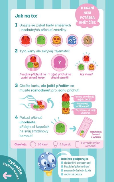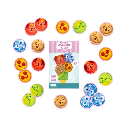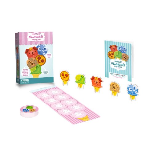 Najlepšia najhoršia zmrzlina je Mačiatková hra od tvorcov Výbušných mačiatok. Táto hra spoločne s ďalšími mačiatkovými hrami vám garantuje skvelú zábavu aj s tými najmenšími. Za jej vznikom stojí štvorročné dievčatko, ktoré spoločne so svojim oteckom (Elan Lee - autor Výbušných mačiatok) vzalo papiere, fixky a nálepky a pustilo sa do vytvárania hier, pri ktorých sa budete baviť a zároveň sa aj niečo naučí te.O čom táto hra je a čo je cieľom? Zbierajte prapodivne vtipné príchute zmrzliny do vášho zmrzlinového kornútku. Aký kopček asi teraz príde na rad? Slimáky? Pizzový? Alebo snáď červíčkový? Ak sa vám podarí správne odhadnúť príchuť, ktorá nasleduje, všetky kopčeky danej zmrzliny sú vaše. Kto ako prvý nazbiera 9 a viac kopčekov zmrzliny do svojho zmrzlinového kornútka, tak vyhráva hru. Táto hra podporuje: dedukčné schopnosti, flexibilné premýšľanie, rozoznávanie obrázkov a rodinného ducha. Obsah balenia: 60 kariet 5 figúrok 5 zmrzlinových kornútov 1 české a slovenské pravidlá