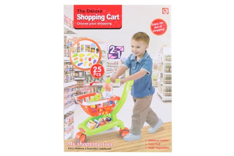 Plastový nákupný košík/vozík na kolieskach. Rozmer samotného košíka cca 36 x 16, Rozmer zloženého vozíka na kolieskach cca 45 x 53 cm. Balenie ďalej obsahuje 25 ks potravín. Rozmery balenia cca 33 x 45 x 21,5 cm. Vek 3+