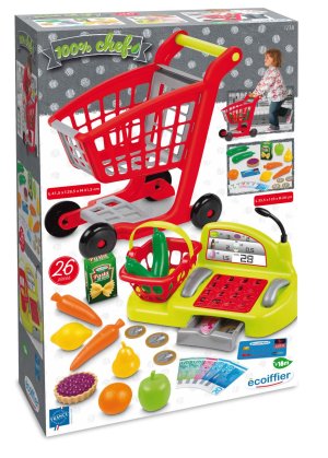 Nákupný vozík s ovocím, zeleninou, potravinami. Súčasťou je aj pokladňa s peniazmi, platobnou kartou, skenerom a mikrofónom. Nechýba ani malý nákupný košík do ruky. Rozmery (DxŠxV) pokladňa: 41,5 x 29,5 x 41,5 cm a vozík: 35,5 x 23 x 20 cm.