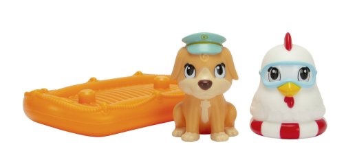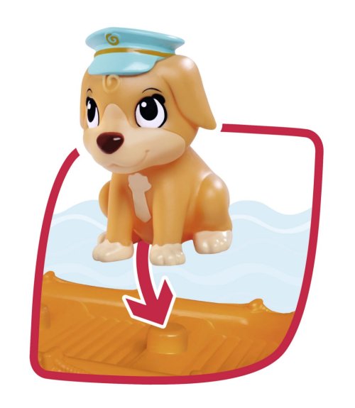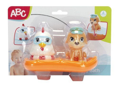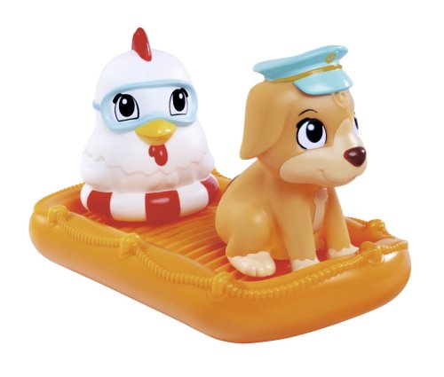 Loďka s vinylovými figúrkami zvierat - pes a kura do vane. Loďka pláva na hladine, zvieratká sa ľahko pripevnia na loď.
