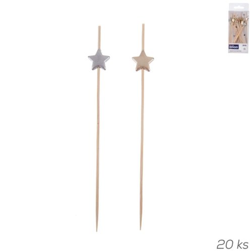 Bambusové napichovátka s farebnou ozdobou v tvare HVIEZDY. Vhodné pri servírovaní drobného slaného alebo sladkého pohostenia pri rôznych príležitostiach, oslavách, na zimnú párty, na vianočné stretnutie. Ozdobia jednohubky, muffiny, tortičky, olivy, kúsky syra. Súprava 20 ks. Mix farieb zlatá a strieborná. Materiál bambus, javorové drevo s farebným nástrekom (ozdoba). Dĺžka 12 cm. EAN 8592381242336