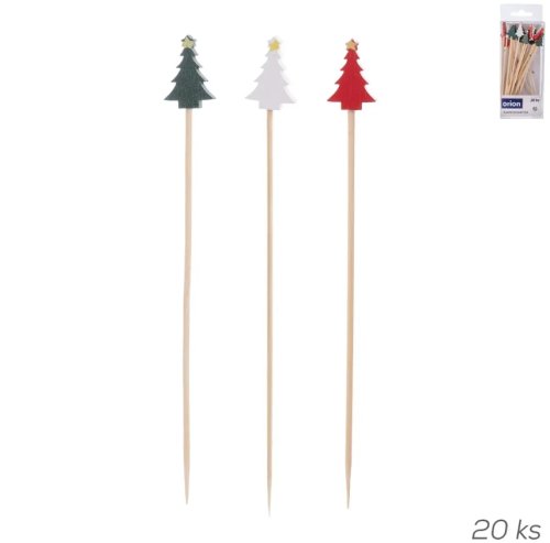 Bambusové napichovátka s farebnou ozdobou v tvare STROMKOV. Vhodné pri servírovaní drobného slaného alebo sladkého pohostenia pri rôznych príležitostiach, oslavách, na zimnú párty, na vianočné stretnutie. Ozdobia jednohubky, muffiny, tortičky, olivy, kúsky syra. Súprava 20 ks. Mix farieb. Materiál bambus, javorové drevo s farebným nástrekom (ozdoba). Dĺžka 13 cm. EAN 8592381242411