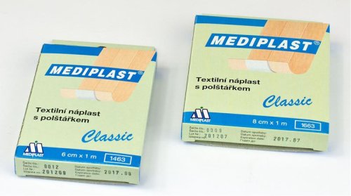 Textilná náplasť s vankúšikom, v krabičke. Vhodná na ošetrenie drobných poranení.