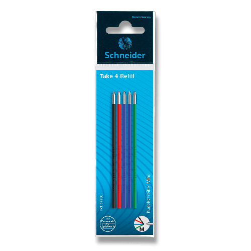 Náhradné náplne do viacfarebné guličkové perá Schneider Take 4. Balenie obsahuje 2 ks modrej a po 1 ks červenej, čiernej a zelenej náplne.