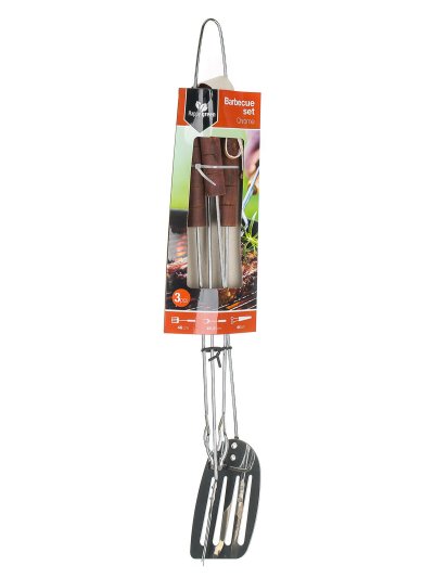 Sada grilovacieho náradia z pochrómovanej ocele. Rukoväť je z dreva. Súprava obsahuje základné náradie potrebné pri grilovaní. Náradie je vybavené pútkami na zavesenie.