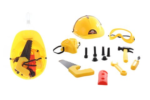 Sada obsahuje helmu, okuliare, masku, pílku, kladivko, kľúč, skrutky a imitáciu dreva. Balené v sieťke.