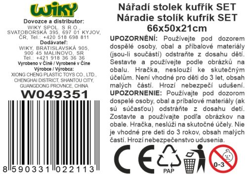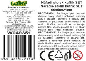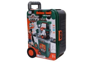Náradie stolík kufrík set. Veľkosť 38 cm. Kufrík je na kolieskach a má vysúvacie madlo. Výška s vysunutým madlom 55,5 cm, výška so zasunutým madlom 38 cm. Kufrík ide prestavať na kutilský stolík s rozmermi: 66x50x21cm. Návod na zostavenie na obale. Obsah balenia stolík, skrutky, ozubené kolesá, zverák a ďalšie príslušenstvo.