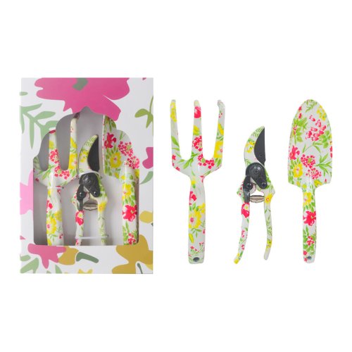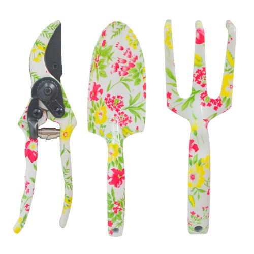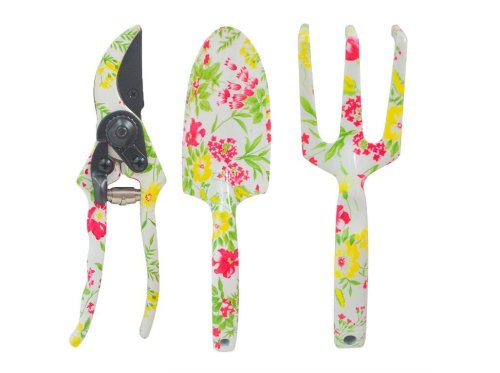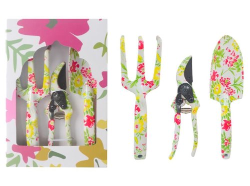Štýlové ručné náradie s kvetinovým motívom, balené v krabičke. Vhodné aj ako darček. Obsahuje malé ručné náradie na presádzanie rastliniek a nožnice na zastrihnutie rastlín.