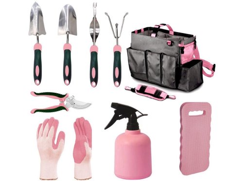 sada ručného záhradného náradia, všetko v ružovom a ružovo-čiernom prevedení