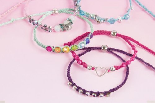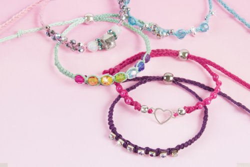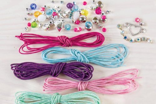 Výroba náramkov z bavlniek a korálikov. Korálky sa vkladajú alebo navliekajú na bavlnky, ktoré sú súčasťou balenia. Obsahuje mnoho farebných a blýskavých korálikov. Balené v krabici. Odporúčaný vek 8+