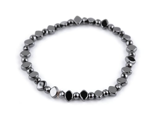 Elegantný náramok je vyrobený z brúsených korálikov pokovovaného hematitu. Vďaka pruženke sa náramok ľahko natiahne na ruku, má univerzálnu veľkosť. Hematitový náramok patrí medzi šperky, ktoré vďaka svojej fascinujúcej povrchovej úprave zaujmú na prvý pohľad. Brúsené plôšky vytvárajú efektné svetelné odlesky. Náramok poteší každú ženu, je darčekom, s ktorým nešliapnete vedľa. Hodí sa k slávnostným príležitostiam, skvele podčiarkne aj business štýl obliekania.