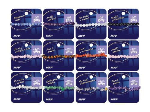 Display s 36 náramkami radu Sentiment, z kolekcie Gifty ponúka širokú škálu doplnkov, ktoré sa zameriavajú na pozitívne životné hodnoty a duchovnú silu. Každý náramok je zastúpený trikrát, čo poskytuje dostatočný výber na rôzne príležitosti a preferencie. Polovica náramkov je tvorená opracovanými kameňmi (korálkami), zatiaľ čo druhá polovica je z prírodných úlomkov, ktoré dodávajú každému náramku unikátny vzhľad. Náramky sú tvorené z prírodných kameňov, z ktorých každý má svoj vlastný význam a symboliku. Kamene boli starostlivo vybrané tak, aby vyjadrovali špecifické vlastnosti, ako je láska, harmónia, ochrana, vnútorný pokoj a pozitívna energia. Vďaka pružnej strune sa náramky ľahko prispôsobia väčšine zápästia, čo zaisťuje pohodlie pri nosení. Okrem estetickej hodnoty sú náramky taktiež hlboko symbolické. Podporte svoju rovnováhu, pritiahnite šťastie a každý deň načerpajte pozitívnu silu – všetko v jednom elegantnom šperku, ktorý si zamilujete! OBSAH BALENIA: - 36 ks náramkov strážny - krištáľ, 3 x Pre lásku a radosť - ruženín, 3 x Skvelé príležitosti - sodalít, 3 x Životná energia a elán - tigrie oko, 3 x Pevné zdravie - ametyst, 3 x Život v rovnováhe - karneol, 3 x Anjel strážny - krištáľ, 3 x Pre lásku a radosť - ruženín, 3 x Spokojná rodina - fluorit, 3 x Na nové dobrodružstvá - avanturín, 3 x Pevné zdravie - ametyst) UPOZORNENIE: Farba sa môže mierne líšiť v závislosti na prirodzených vlastnostiach kameňa . Uvedená cena je za 1 balenie.