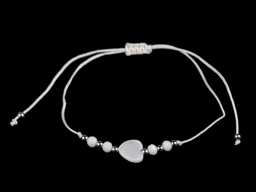 Náramky s perleťovým srdiečkom sú dokonalým doplnkom letného outfitu. Hodí sa ako k šatám, tak k blúzkam, tričkám aj plavkám. Predávajú sa ako súprava 12 ks na papierovej karte na zavesenie, každý náramok má inú farbu. Na šnúrky je doprostred navlečené srdiečko veľké 1 cm, brúsené a kovové korálky. Zapínanie je posuvné, oba konce náramku prechádzajú stredovým uzlom, ktorý umožňuje utiahnutie šnúrok. Náramok má univerzálnu veľkosť.
