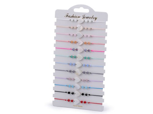 Náramky s perleťovým srdiečkom sú dokonalým doplnkom letného outfitu. Hodí sa ako k šatám, tak k blúzkam, tričkám aj plavkám. Predávajú sa ako súprava 12 ks na papierovej karte na zavesenie, každý náramok má inú farbu. Na šnúrky je doprostred navlečené srdiečko veľké 1 cm, brúsené a kovové korálky. Zapínanie je posuvné, oba konce náramku prechádzajú stredovým uzlom, ktorý umožňuje utiahnutie šnúrok. Náramok má univerzálnu veľkosť.