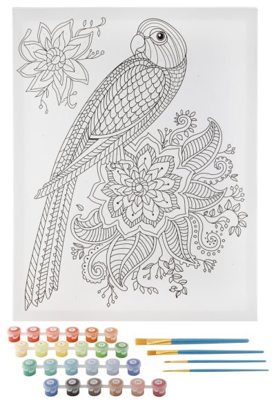 Maľovanie na plátno 40 x 50 cm Návod na maľovanie: 1. Než začnete, rozložte si všetok obsah balenia. Farby sú očíslované, rovnaké čísla sú aj na plátne. Každá farba má svoje číslo. 2. Najskôr začnite maľovať svetlými farbami. Postupne vyplňujte očíslované políčka. 3. Po každej zmene farby, nezabudnite dôkladne vymyť štetec, aby sa vám farby nezmiešali. 4. Nakoniec maľujte tmavými farbami. Ak ste pretiahli okraje, tmavou farbou to opravíte. BALENIE OBSAHUJE: Plátno 40 x 50 cm zabalené v strečovej fólii, 4 x maliarske štetce, 24 akrylových farieb