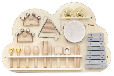 Nástenná hra s prvkami hudobných nástrojov. Rozmery dosky 75x48x6, 6 cm. Balené v krabici. Rozmery balenia cca 82x56x9 cm. Vek 3+