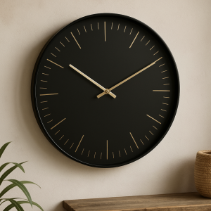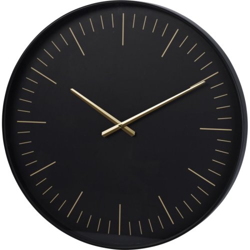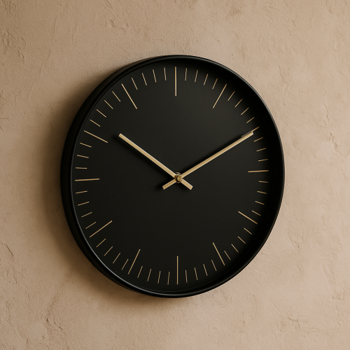 Elegantné nástenné hodiny v modernom dizajne s čiernym ciferníkom a zlatými líniami a ručičkami. Skvele doplnia interiér a zároveň sú praktickým pomocníkom pri sledovaní času.
