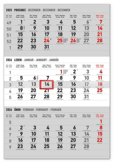 Praktický plánovací kalendár s trojmesačným rozložením a orientačnou lištou s posuvným jazdcom. Obsahuje kalendárium s českými menami a svetovými sviatkami na šedom pozadí.
