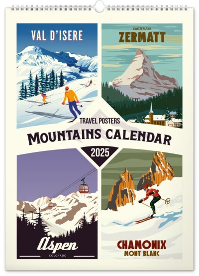 Veľkoformátový kalendár so starostlivo vybranými klasickými plagátmi horských stredísk.