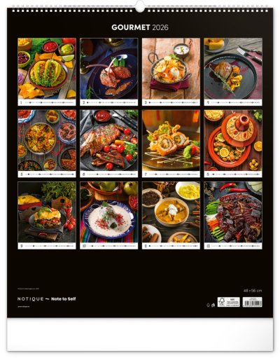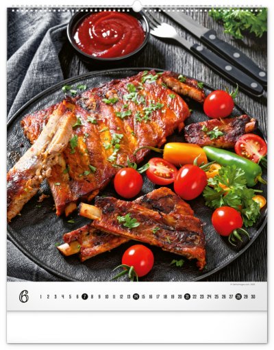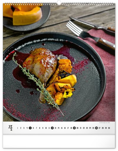 Veľkoformátový kalendár z kolekcie Platinum Collection obsahuje fotografie luxusných pokrmov, ktoré budete chcieť ochutnať. Šťavnaté steaky, krídielka aj stehienka alebo oku lahodiace dezerty oživia interiér v každej kuchyni či jedálni. Kalendár zahŕňa jednoduché kalendárium.