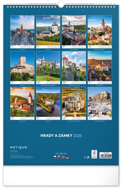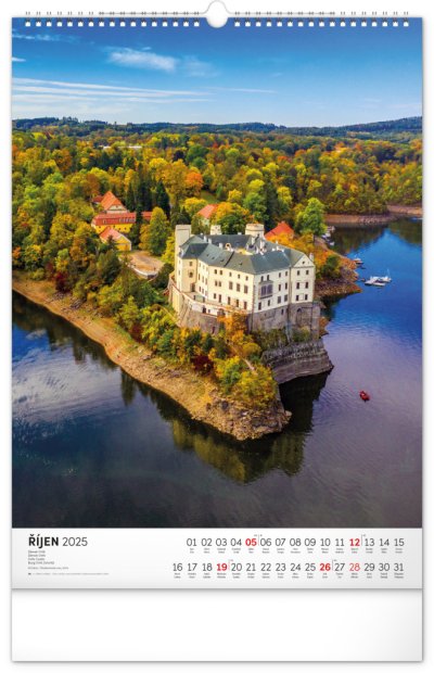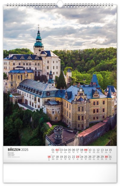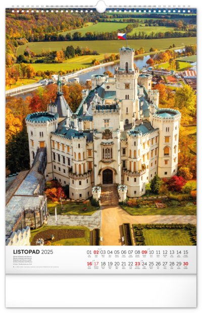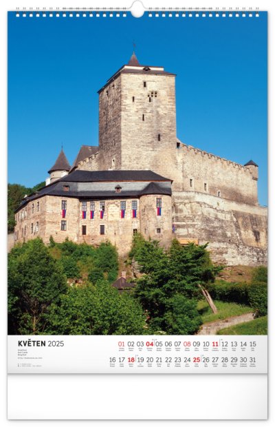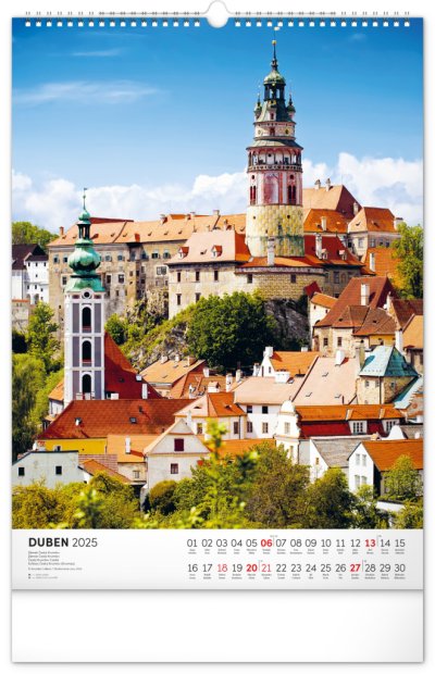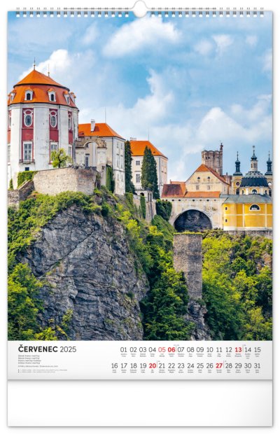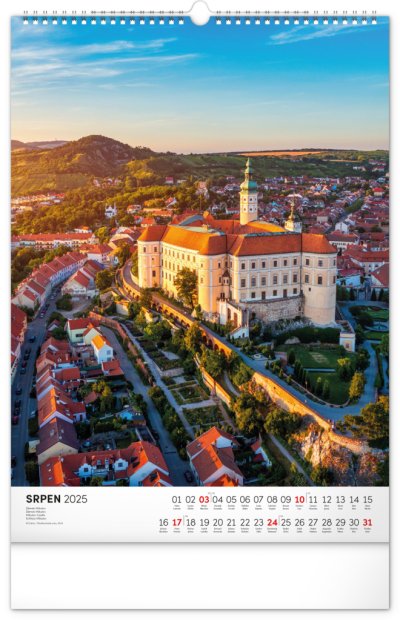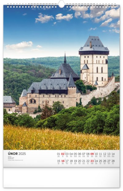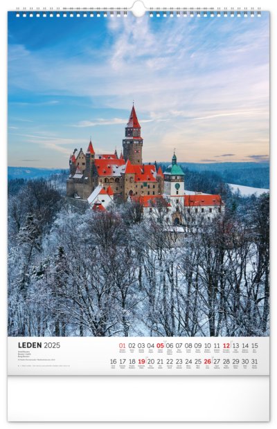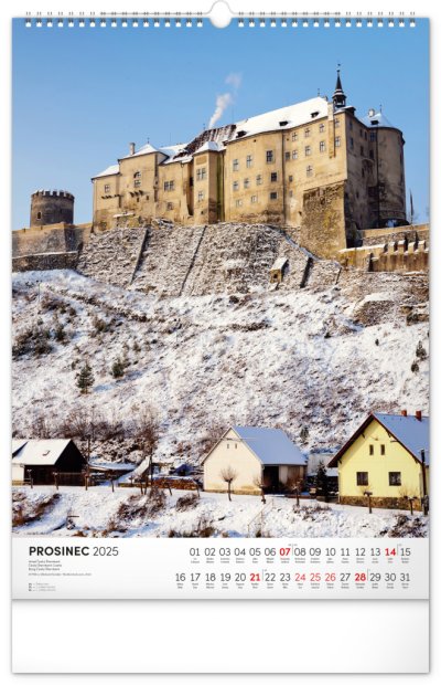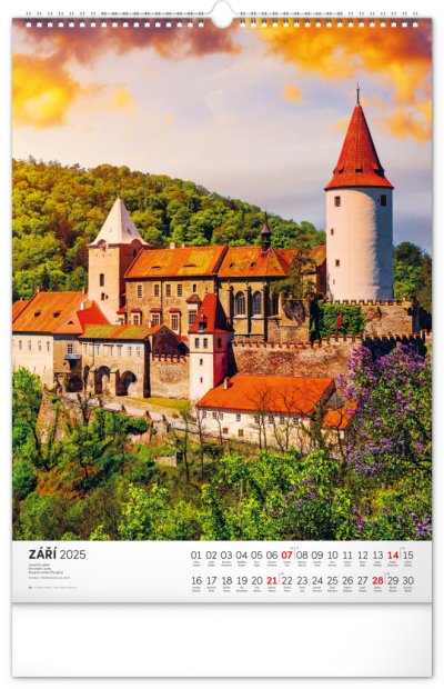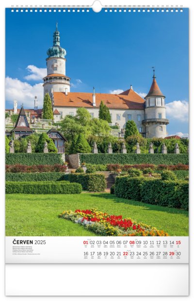 Farebné fotografie Lakťa, Chladničky, Hlboké či Bouzova na stránkach nástenného kalendára vo výškovom formáte. Jednoduché kalendárium s českými sviatkami a menami.