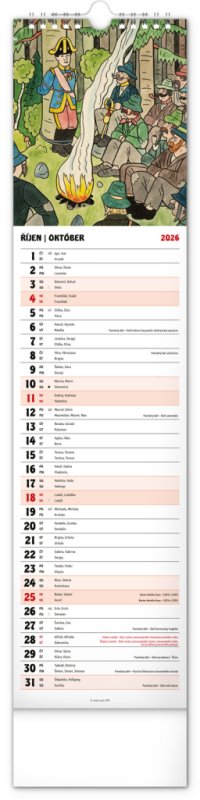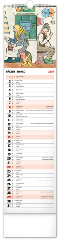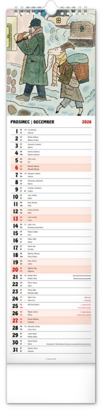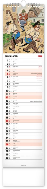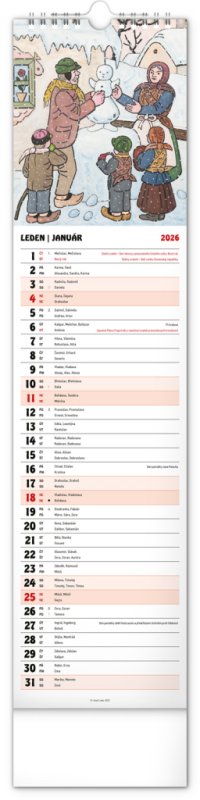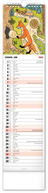 Nástenný kalendár s ilustráciami Jozefa Lady a jeho rozprávkovými motívmi je vyhotovený v obľúbenom úzkom formáte, ktorý osvieži každý interiér. V kalendári je rovnocenne zahrnutá čeština a slovenčina, ilustrácie dopĺňajú české a slovenské mená, sviatky, pamätné dni a mesačné fázy. Každý deň má priestor na poznámky, víkendové dni sú farebne odlíšené od pracovných.