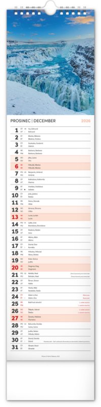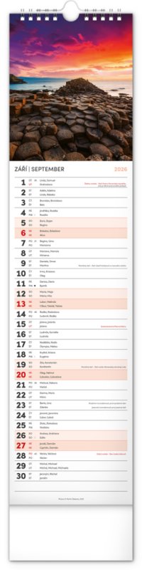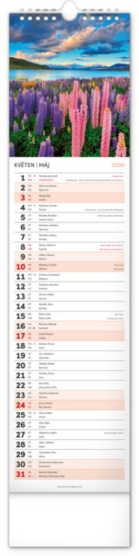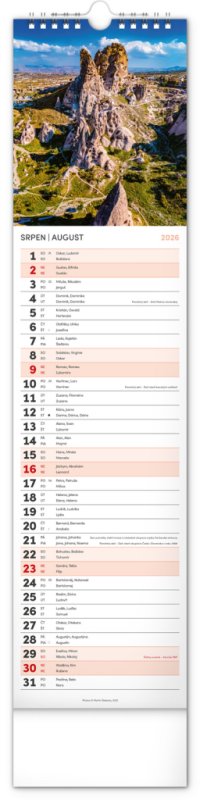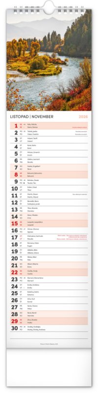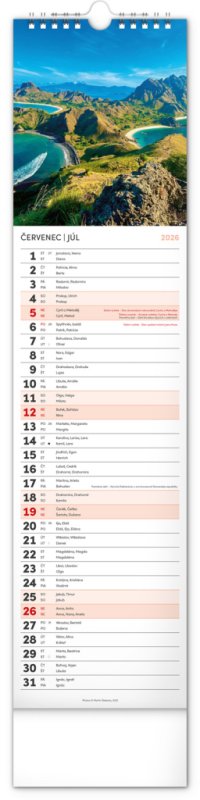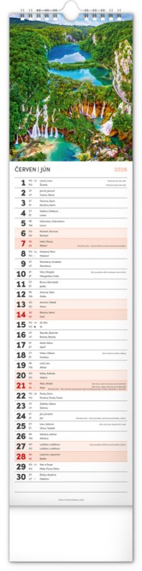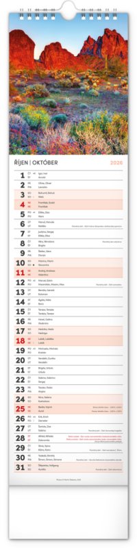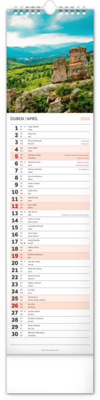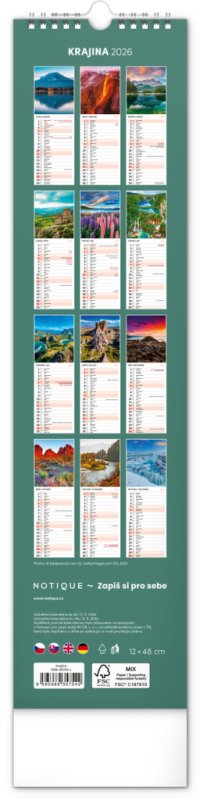 Urobte si radosť pohľadom na fotografie malebnej krajiny v praktickom úzkom formáte česko-slovenského nástenného kalendára. Kalendár obsahuje české a slovenské mená, sviatky, pamätné dni aj mesačné fázy. V každom jednotlivom dni je priestor pre poznámky.