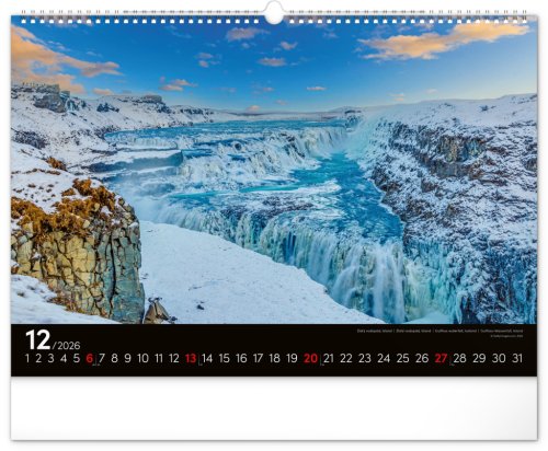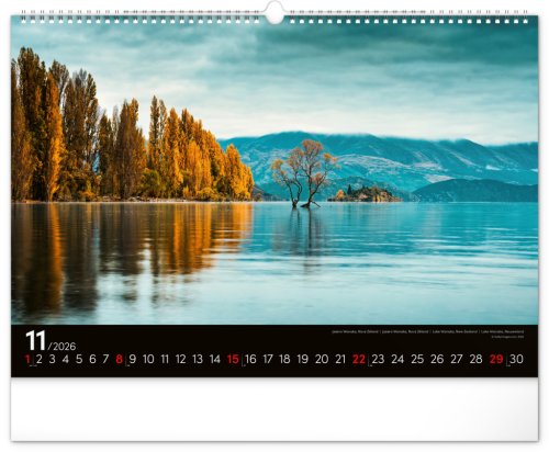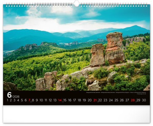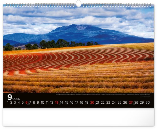 Fotografie dvanásť pestrofarebných prírodných výjavov z celého sveta. Romantické zábery horských údolí i nížin, vodstiev i púští. Jednoduché kalendárium na čiernom pozadí.