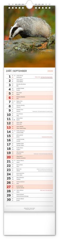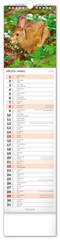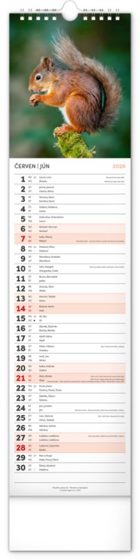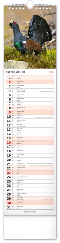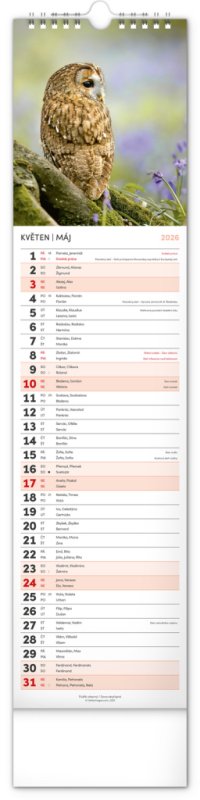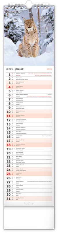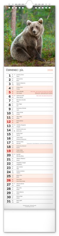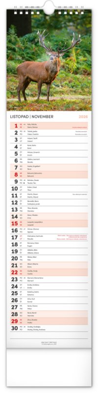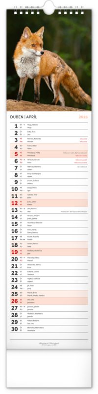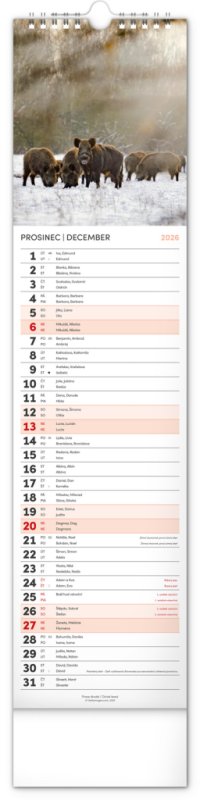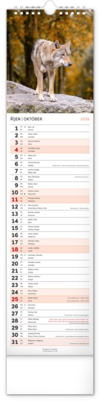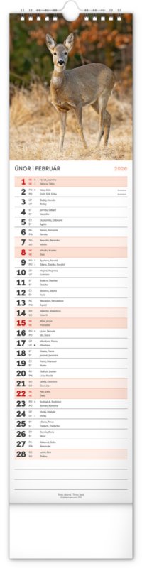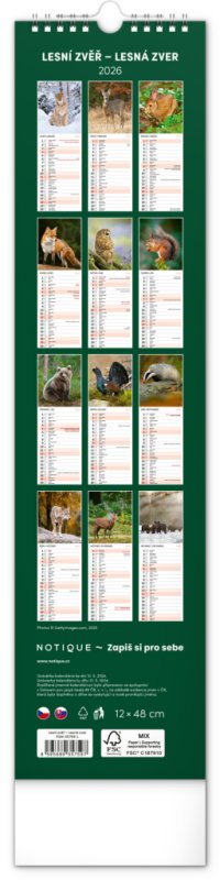 Pre milovníkov prírody a lesných zákutí - tento podlhovastý a zároveň praktický kalendár vás vezme medzi jelene, líšky a šumiace stromy. Česko-slovenský nástenný kalendár obsahuje dvanásť snímok zvierat z našich lesov. Je dvojjazyčný a nájdete v ňom ako české, tak slovenské mená, sviatky, pamätné dni aj mesačné fázy. V každom jednotlivom dni je priestor pre poznámky.