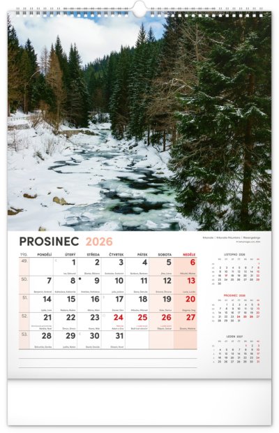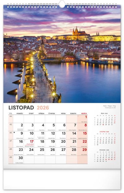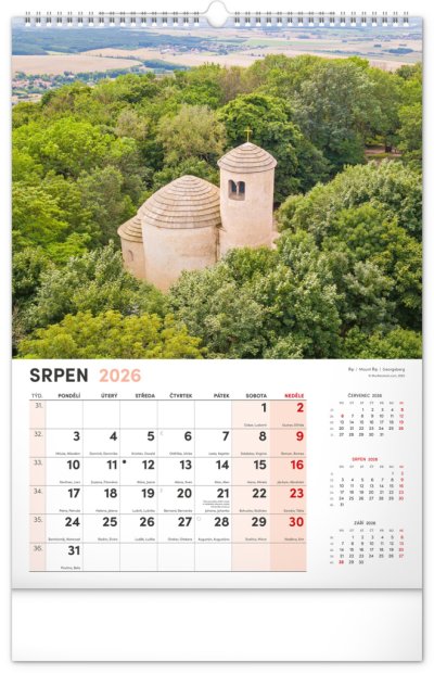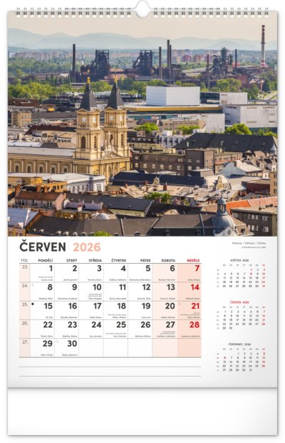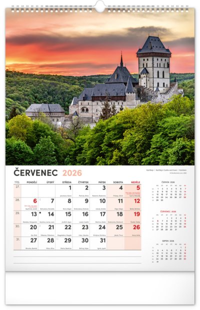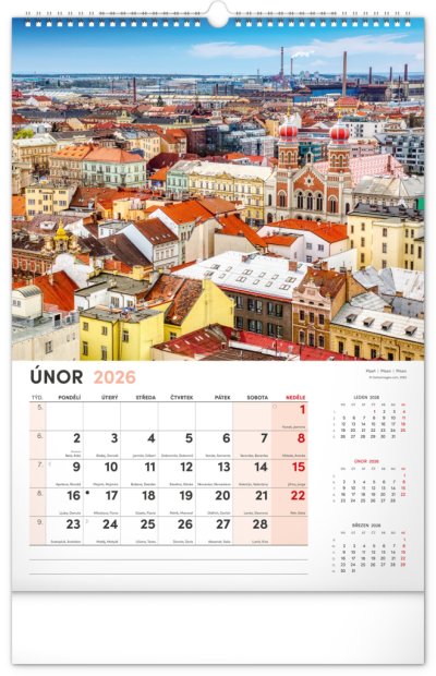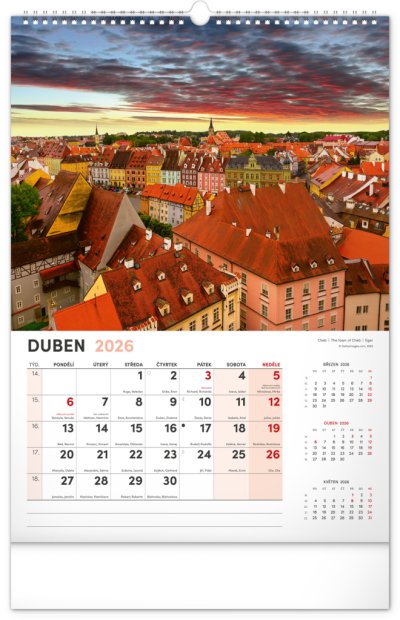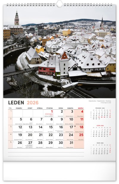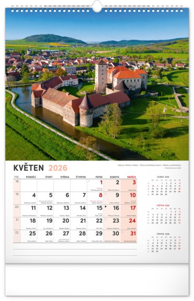 Kalendár s fotografiami z najkrajších miest Českej republiky. Praha, Kutná Hora, Olomouc a ďalšie skvosty v kalendári s témou Má vlasť vo výškovom formáte s menovkami a jednoduchým kalendáriom.