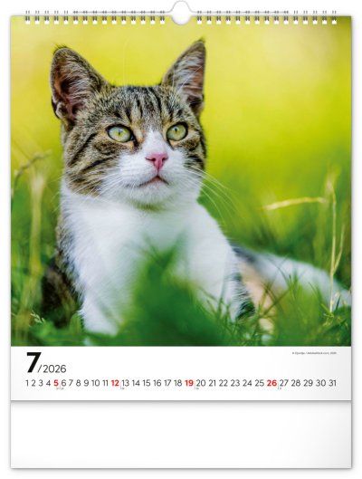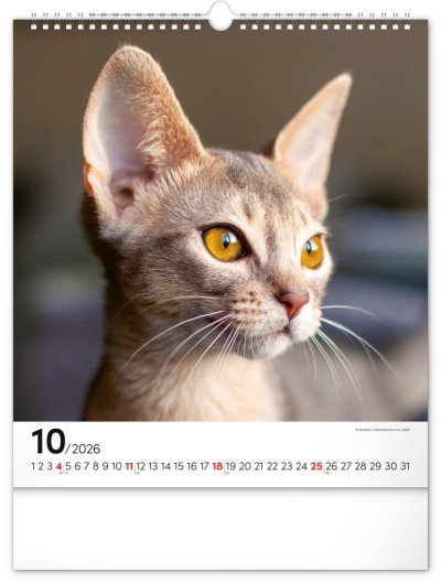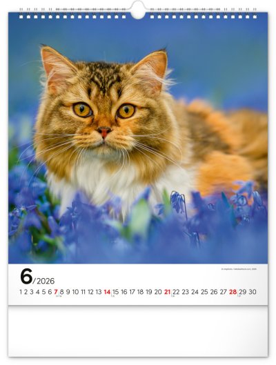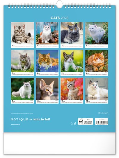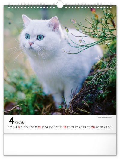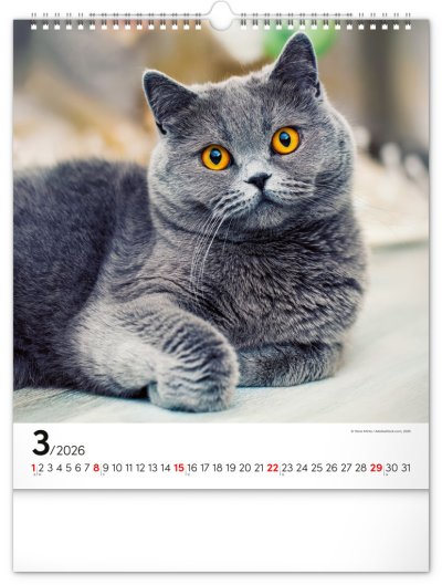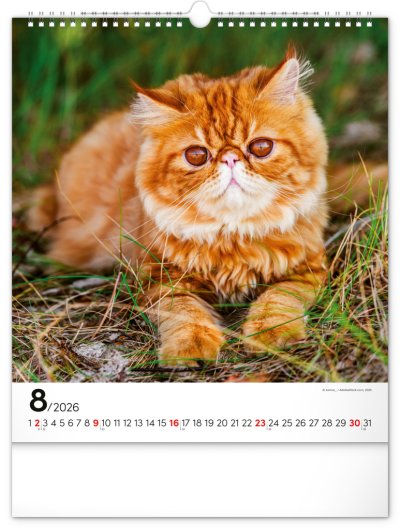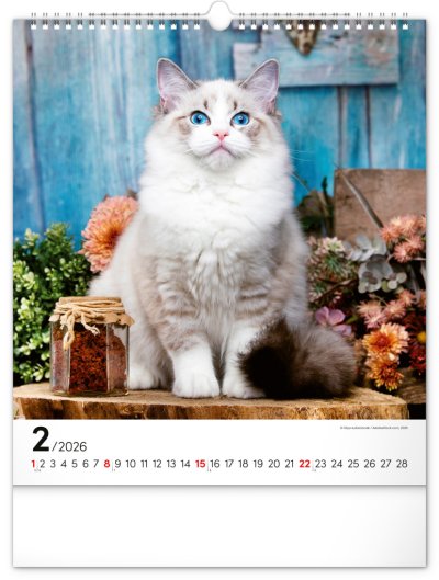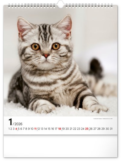 Fotografie osobitých mačiek na stránkach obľúbeného nástenného kalendára s univerzálnym kalendáriom na bielom pozadí.