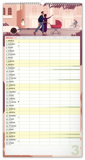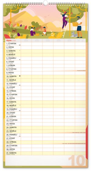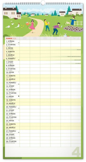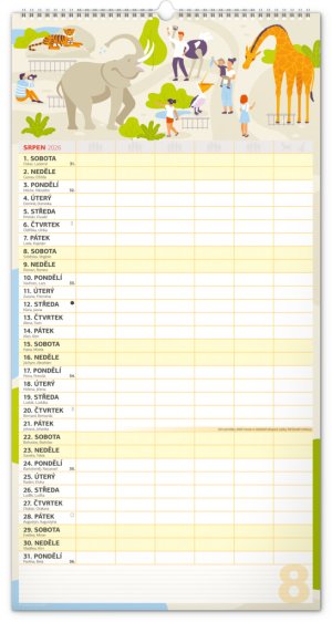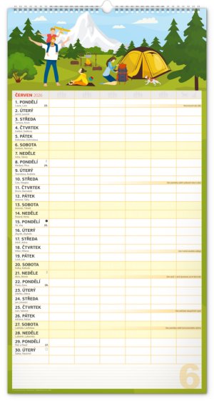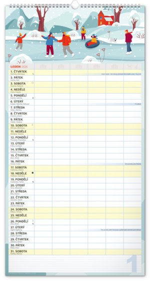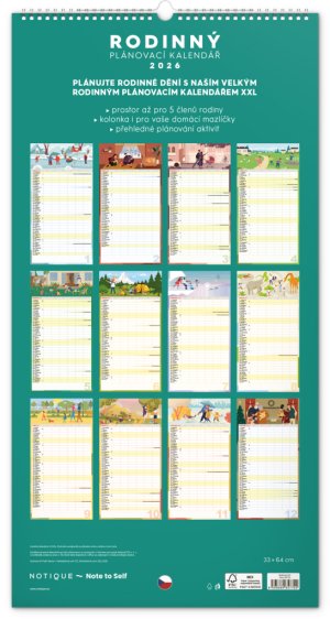 Veľký formát (33 x 64 cm) kalendára pre celú rodinu. České kalendárium a samostatný plánovač aktivít až pre šesť členov domácnosti dopĺňajú veselé grafické motívy pre každé ročné obdobie. Vďaka dostatočnému priestoru pre poznámky vám neutečie žiadna dôležitá udalosť.