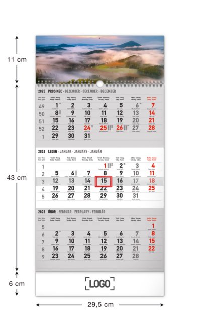 Praktický plánovací kalendár s trojmesačným rozložením, orientačnou lištou s posuvným jazdcom a užitočným ročným prehľadom. Obsahuje kalendárium s českými menami a svetovými sviatkami na tmavo modrom pozadí.