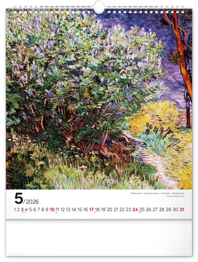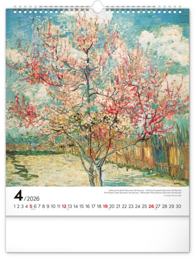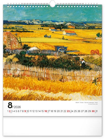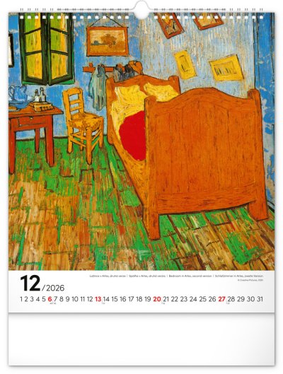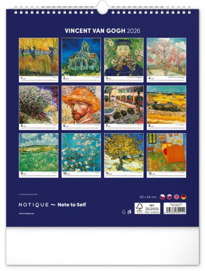 Na stranách kalendára v obdĺžnikovom formáte nájdete najznámejšie van Goghove diela vytlačené na kvalitnom papieri s vysokou gramážou. Kalendár obsahuje univerzálne kalendárium a popisky v štyroch jazykoch.