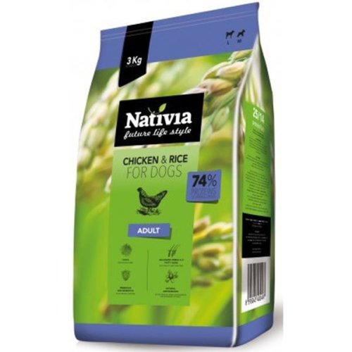 Receptúra rešpektuje prirodzené zákonitosti výživy psa. Obvyklá kombinácia obilnín či zemiakov je úplne nahradená iba kvalitnou ryžou. Tá svojou stráviteľnosťou a profilom aminokyselín tieto tradičné suroviny prevyšuje, nezaťažuje organizmus a spoločne s ostatnými komponentmi výrobku zaistí zdravú výživu psa. Nativia Adult v rade Chicken&rice obsahuje 74% bielkovín živočíšneho pôvodu a radí sa tak medzi popredné značky na trhu. Zloženie: zrná obilnín a výrobky z nich získané (kvalitná ryža 53 %), výrobky zo suchozemských zvierat a výrobky z nich získané (kvalitné hydinové dehydrované mäso 31 %, hydinový tuk 5 %), hľuzy, korene a výrobky z nich získané (cukrovarské rezne sušené 4 %, extrakt z čakanky 0,1 %), minerálne látky, ryby, ostatné vodné živočíchy a výrobky z nich získané (lososový olej 0,5 %), pivovarské kvasnice, ostatné rastliny, riasy a výrobky z nich získané (juka 0 ,02 %). Analytické zložky: hrubý proteín 25 %, hrubé oleje a tuky 14 %, hrubá vláknina 3 %, hrubý popol 6,8 %, vápnik 1,35 %, fosfor 0,9 %, sodík 0,35 %. Dávkovanie: