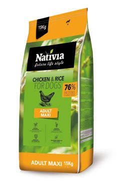 Receptúra rešpektuje prirodzené zákonitosti výživy psa. Obvyklá kombinácia obilnín či zemiakov je úplne nahradená iba kvalitnou ryžou. Tá svojou stráviteľnosťou a profilom aminokyselín tieto tradičné suroviny prevyšuje, nezaťažuje organizmus a spoločne s ostatnými komponentmi výrobku zaistí zdravú výživu psa. Nativia Adult maxi v rade Chicken&Rice obsahuje 76% bielkovín živočíšneho pôvodu.