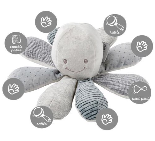 Táto chobotnička sa stane prvým skutočným kamarátom Vášho bábätka, ktorá ho upokojí, dodá pocit bezpečia a komfortu. Chobotnička je vhodným kamarátom pre Vaše bábätko od jeho narodenia, a bude ho sprevádzať celým jeho detstvom, ako verný spoločník a kamarát. Chobotnička je vyrobená z jemného a na dotyk príjemného materiálu.