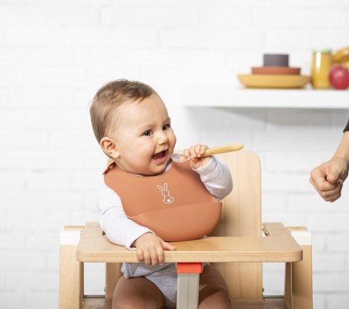 Podbradník Nattou vyrobený z pružného silikónu s motívom roztomilých králikov a praktickou zbernou časťou zaistí kŕmenie a jedenie vášho dieťatka bez zbytočného stresu z neporiadku.