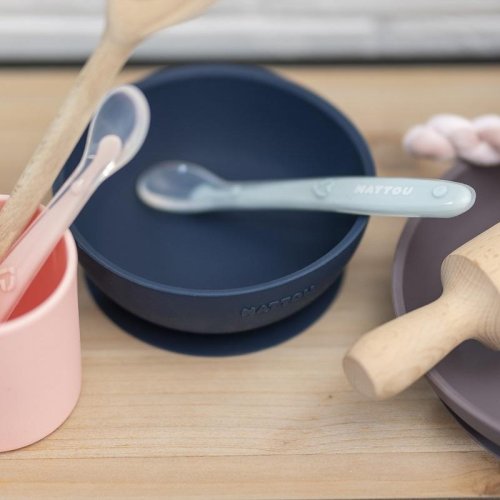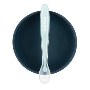 Dvojdielny jedálenský set od Nattou z mäkkého silikónu je veľmi praktický, ľahko uchopiteľný a protišmykový. Set obsahuje misku s prísavkou a lyžičku. Zaoblené vnútorné hrany misky uľahčujú naberanie potravín detičkám a ich rodičom.