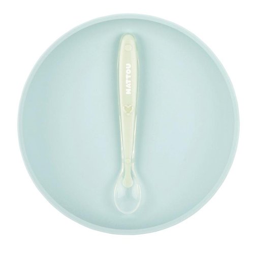 Dvojdielny jedálenský set od Nattou z mäkkého silikónu je veľmi praktický, ľahko uchopiteľný a protišmykový. Set obsahuje tanierik s prísavkou a lyžičku. Zaoblené vnútorné hrany tanierika uľahčujú naberanie potravín detičkám a ich rodičom.