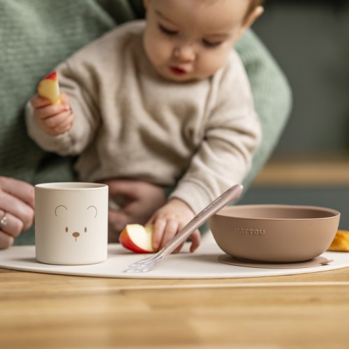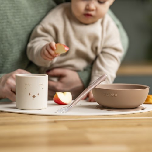 S touto elegantnou silikónovou jedálenskou súpravou môže vaše dieťatko jesť bez obáv. Zvýšený okraj taniera a prísavná podstava zabraňujú vylievaniu jedla na zem. Lyžička je dokonale prispôsobená malým rúčkam a ústam bábätiek a malých detí, takže sa stáva ideálnym pomocníkom pri kŕmení a učení sa samostatnosti.