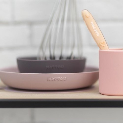 Štvordielny jedálenský set od Nattou z mäkkého silikónu je veľmi praktický, ľahko uchopiteľný a protišmykový. Set obsahuje tanierik a misku s prísavkou, hrnček a lyžičku. Zaoblené vnútorné hrany misky a tanierika uľahčujú naberanie potravín detičkám a ich rodičom.