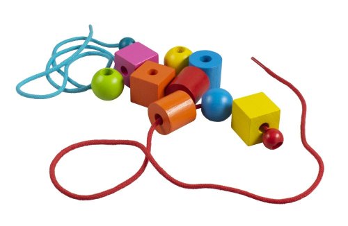 Drevené maxiperle rôznych tvarov s priemerom 20 mm so šnúrkou na navliekanie v plastovom vedierku.