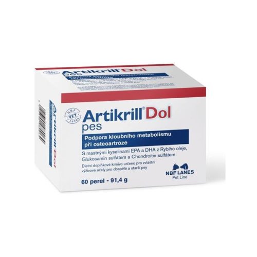 NBF Lanes Artikrill Dol je doplnkové krmivo vo forme kapsúl určené pre dospelých a starších psov s osteoartrózou. Je 100% prírodný, podporuje kĺbový metabolizmus, tlmí bolesť a zápaly a chráni kĺbovú chrupavku. Obsahuje nenasýtené mastné kyseliny z rybieho oleja (EPA a DHA), glukosamín sulfát a chondroitín sulfát. Je vhodné ako súčasť nutraceutickej liečby najmä v počiatočnej fáze osteoartrózy, kedy prispieva k zlepšeniu pohyblivosti a kvality života psa. Zloženie: rybí olej (35% EPA – 25% DHA) 20,9%, želatína (hovädzie), glukosamín (chitosamín) z fermentácie 17,4%, chondroitín sulfát 11,5%, glycerol, krilový olej 2,4%, extrakty z bylín (prášok malokveté) 1,6 %, vedľajšie produkty včelárstva (včelí vosk). Doplnkové látky: Nutričné prídavné látky: 3a700 vitamín E 49 342 mg/kg. Senzorické prídavné látky: botanicky definované prírodné produkty: výťažok z vŕby bielej (Salix alba L.) 32 894 mg/kg, 2b163 výťažok z kurkumy (Curcuma longa L.) 19 736 mg/kg. Aromatické látky: zmes aromatických látok. Technologické prísady: 1c322i lecitíny, E551b koloidný kremičitan. Dávkovanie: