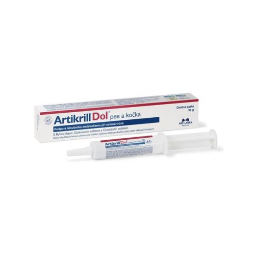 NBF Lanes Artikrill Dol je doplnkové krmivo vo forme pasty určené pre psy a mačky všetkých vekových kategórií s osteoartrózou. Je 100% prírodný, podporuje kĺbový metabolizmus, tlmí bolesť a zápaly a chráni kĺbovú chrupavku. Obsahuje rybí olej, glukosamín sulfát a chondroitín sulfát. Pasta je vhodná ako súčasť nutraceutickej liečby najmä v počiatočnej fáze osteoartrózy, kedy prispieva k zlepšeniu pohyblivosti a kvality života zvieraťa. Zloženie: glukosamín (chitosamín) získaný fermentáciou 12,5 %, chondroitín sulfát 9,99 %, extrakt sladu z jačmeňa, hydrolyzované živočíšne proteíny (hydinového pôvodu), rybí olej (35 % EPA, 25 % DHA) 8 %, krilový olej spracovaním bylín (prášok z listov Verbascum thapsus – divozely malokveté). Doplnkové látky: Nutričné prísady: 3a700 vitamín E (RRR-alfa-tokoferol acetát) 50 000 mg/kg, 3a911 L-karnitín L-tartát (LCLT) 50 000 mg/kg. Stopové prvky: 3b503 síran mangánatý monohydrát 10 255 mg/kg (mangán 3 332,8 mg/kg). Aminokyseliny: 3c301 D,L-metionín 5 000 mg/kg. Senzorické prísady: botanicky definované prírodné produkty: extrakt z vŕby bielej (Salix albumu L.) 12 500 mg/kg. Technologické prísady: E551b oxid kremičitý, 1c322i lecitíny, E460 mikrokryštalická celulóza, E202 sorban draselný, E330 kyselina citrónová, E263 acetát vápenatý. Dávkovanie: