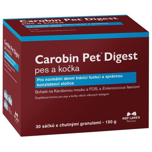 NBF Lanes Carobin Pet Digest je prírodné doplnkové krmivo vo forme prášku určené pre psy a mačky všetkých vekových kategórií. Obsahuje karobovú múčku, fruktoligosacharidy (FOS) a probiotikum Enterococcus faecium, ktoré podporujú správnu funkciu tráviaceho traktu. Pôsobí proti nadúvaniu, zápachu z papule, kručeniu v bruchu a koprofágii. Zlepšuje konzistenciu stolice a prispieva k hygiene perianálnej oblasti. Neobsahuje živočíšne bielkoviny, a je teda vhodné aj pri diétnom režime. Zloženie: karobová múčka 52,5%, FOS (fruktoligosacharidy) 20%, kvasnice (pivovarské kvasnice), pyrofosfát sodný, lupinová proteínová múčka, horečnatá soľ kyseliny stearovej, chlorid sodný, rastlinné oleje a tuky. Doplnkové látky: Nutričné prísady: provitamíny a chemicky presne definované látky s podobným účinkom: vitamín B 12 (kyanokobalamín) 3 mg/kg. Zootechnické prísady: stabilizátory črevnej mikroflóry: 4b1707 Enterococcus faecium DSM 10663-NCIMB 10415 (1,0×10 11 CFU/kg). Technologické prísady: zrážaný oxid kremičitý, 1b306 (i) tokoferoly extrahované z rastlinných olejov. Dávkovanie: 1 vrecúško denne Návod na použitie: Podávajte psom a mačkám perorálne. Zmiešajte obsah vrecka s bežným krmivom, ideálne mokrým. Pokiaľ používate suché krmivo, mierne ich navlhčite, aby sa prášok lepšie prichytil a zviera ho bez problémov prijalo. Neprekračujte odporúčané dávkovanie. Upozornenie: Zvieraťu vždy zaistite čerstvú pitnú vodu. Určené iba pre zvieratá! Uchovávajte mimo dosahu detí. Pred začatím užívania sa odporúča konzultácia s veterinárnym lekárom.