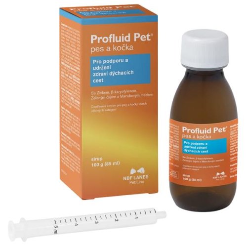 NBF Lanes Profluid Pet je prírodné doplnkové krmivo vo forme chutného sirupu pre psy a mačky, ktorý podporuje zdravie dýchacích ciest, skvapalňuje hlien, chráni sliznice a upokojuje kašeľ. Obsahuje zinok, β-karyofylén, zelený čaj a manukový med. Zloženie: glukózový sirup, glycerol, vedľajšie produkty včelárstva (manukový med 4,16 %), hydrolyzované živočíšne bielkoviny (hydinového pôvodu), produkty získané spracovaním bylín (opuncie mexická – Opuntia ficus indica L. – prášok z plochých stoniek), sachar %, produkty získané spracovaním rastlín (ananás – Ananás comosus L. – prášok zo stonky) 0,4 %, rastlinné oleje a tuky (rafinovaný olej z čiernych ríbezlí – Ribes nigrum L.) 0,1 %, arabinogalaktan z smrekovcovej kôry 0,04 %, vedľajšie produkty včelár. Doplnkové látky: Nutričné prísady: 3b607 chelát glycínu a zinku, hydratovaný (pevná forma) 416,6 mg/kg (zinok 112,5 mg/kg). Organoleptické prísady: botanicky definované prírodné produkty: sladké drievko (Glycyrrhiza glabra L.) 41 666,6 mg/kg, zelený čaj (Camellia sinensis (L.) O. Kuntze) extrakt 2083,3 mg/kg, tymian (Thymus vuléric/L. Aromatické látky: 2b01007 beta-karyofylén 208 mg/kg. Technologické prísady: 1k202 sorban draselný, 1a330 kyselina citrónová, 1a263 octan vápenatý, E466 karboxymetylcelulóza, E412 guarová guma. Dávkovanie: