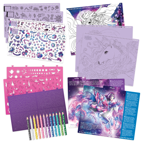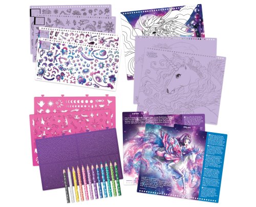 Vytvárajte magické a úžasné kresby fantasy koní, ktorí budú ako stvorení na hranie medzi hviezdami. Využite množstvo rôznych nálepiek, šablón a techník, ktoré vám pomôžu vytvoriť kone vašich snov. Obsah balenia: 250 nálepiek, 12 pasteliek, 80 šablón, 35 listov s obrázkami, 4 plastové formičky na vzorovanie, 12 kresliacich techník s návodom Odporúčaný vek: 7+