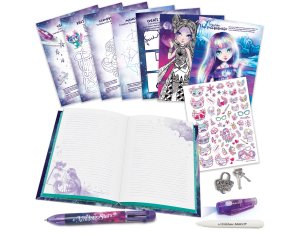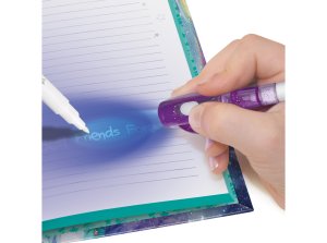 Obsah balenia: tajný denníček formátu A5, 44 strán s úlohami, 1 farebné pero, 1 kúzelné pero, zámok s kľúčikom